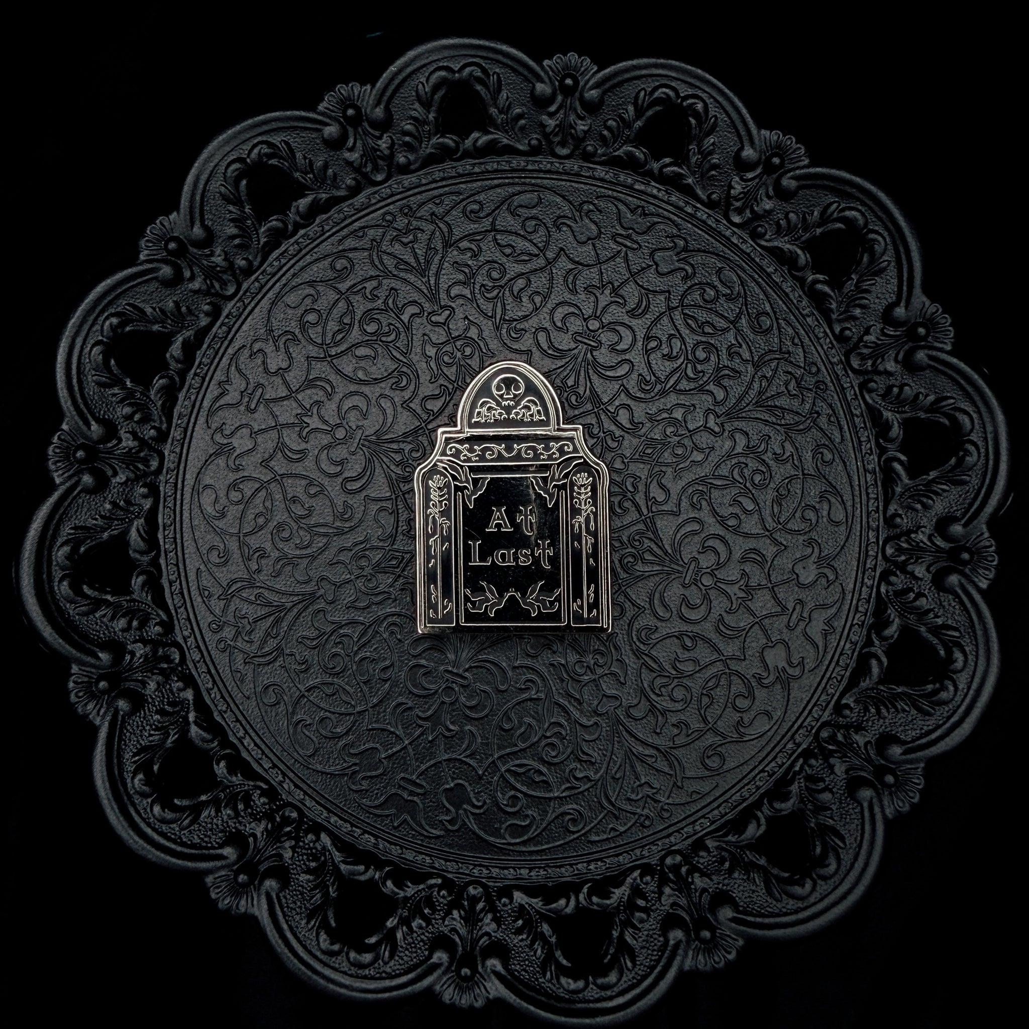 A hard gold enamel pin inspired by New England cemeteries and being tired!