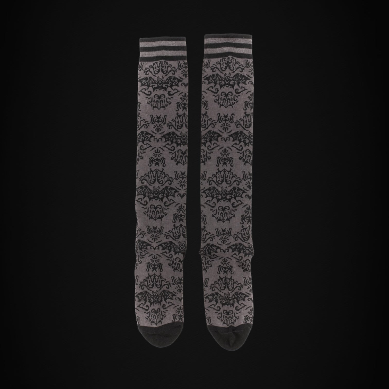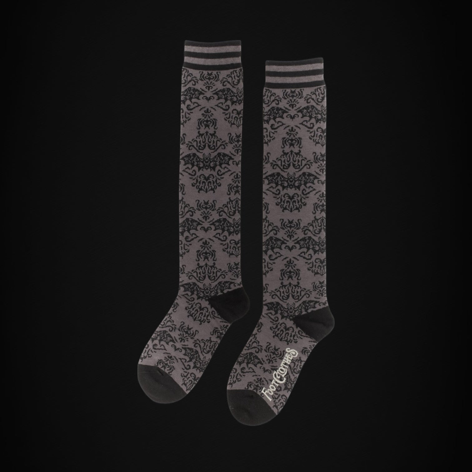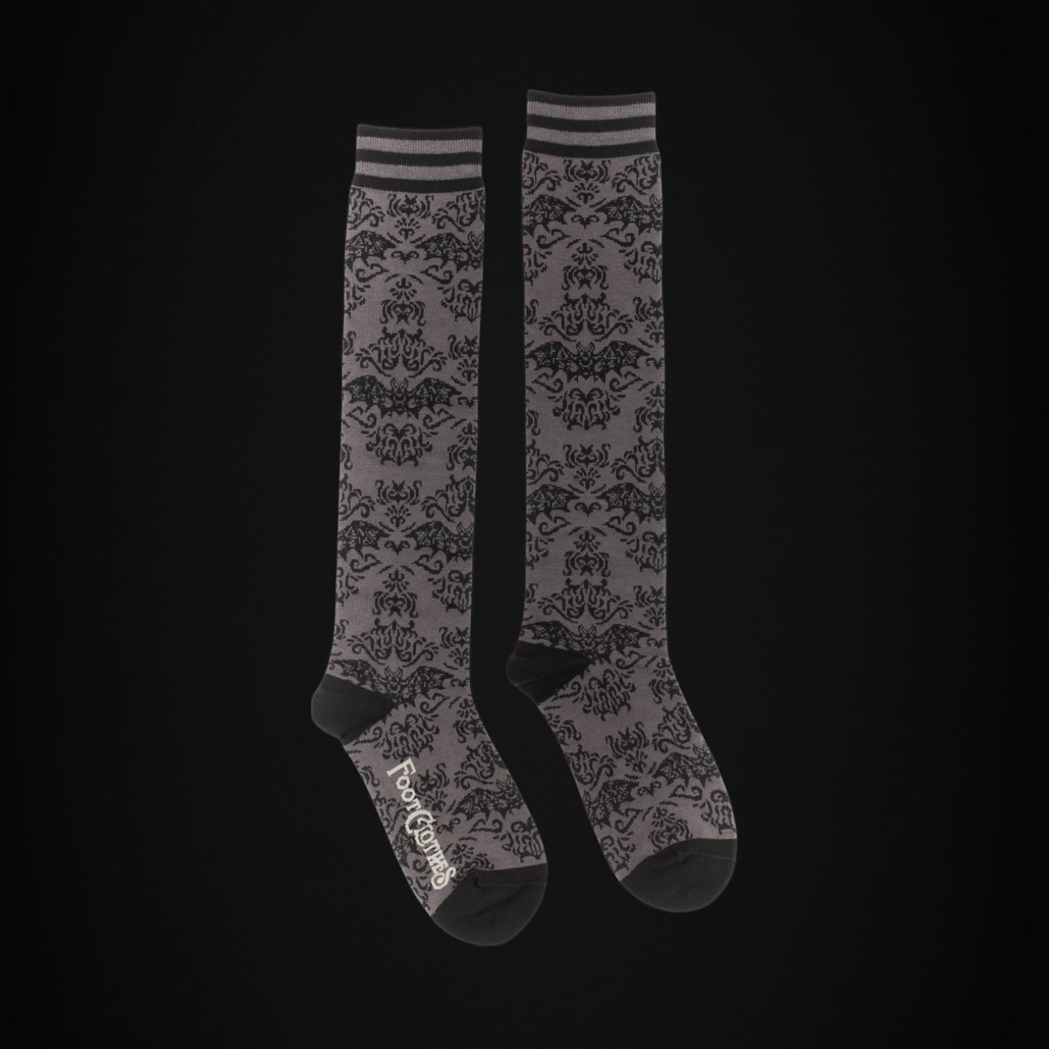Intricate damask with mysterious bats, all wrapped up in classic knee highs! Prepare to make a statement with these!