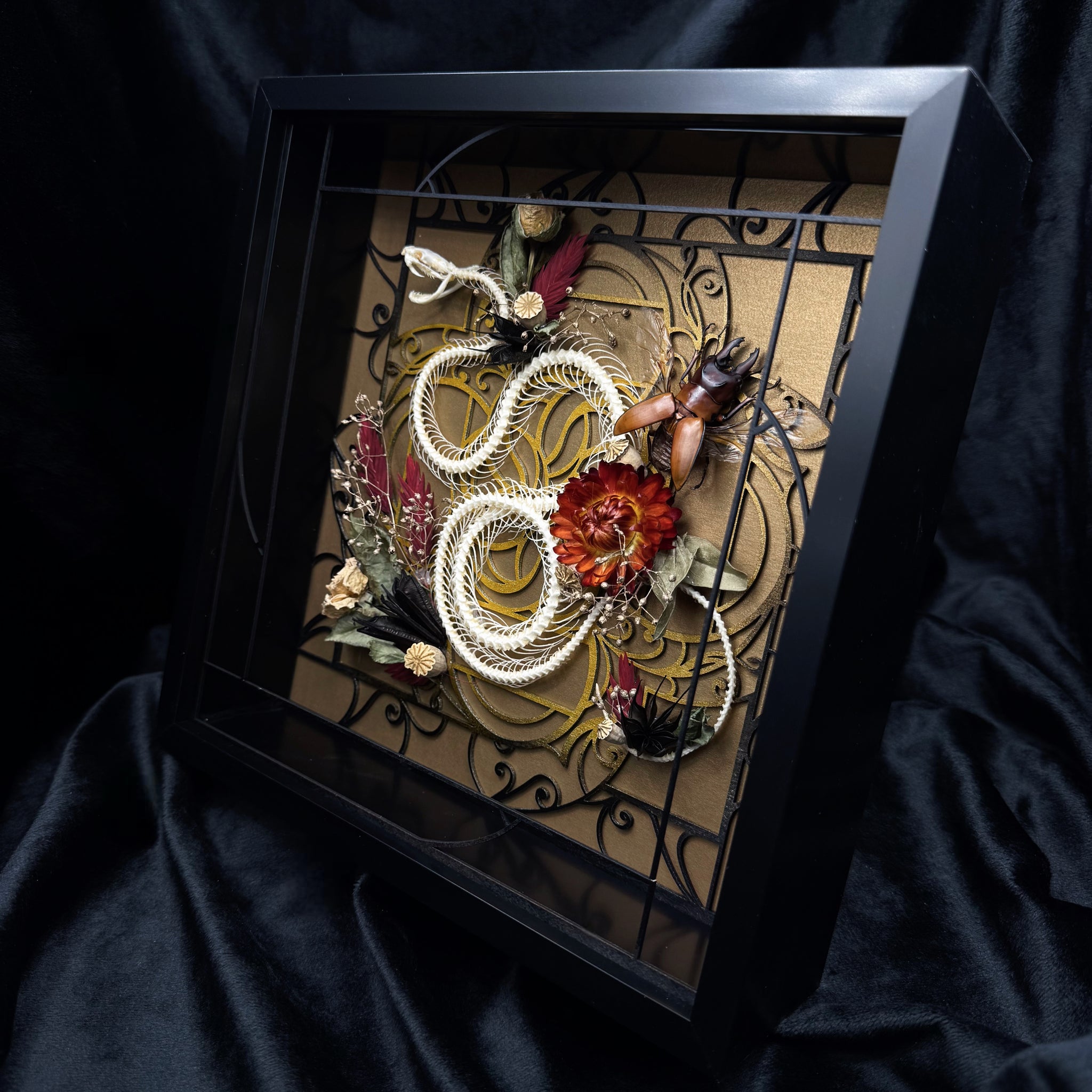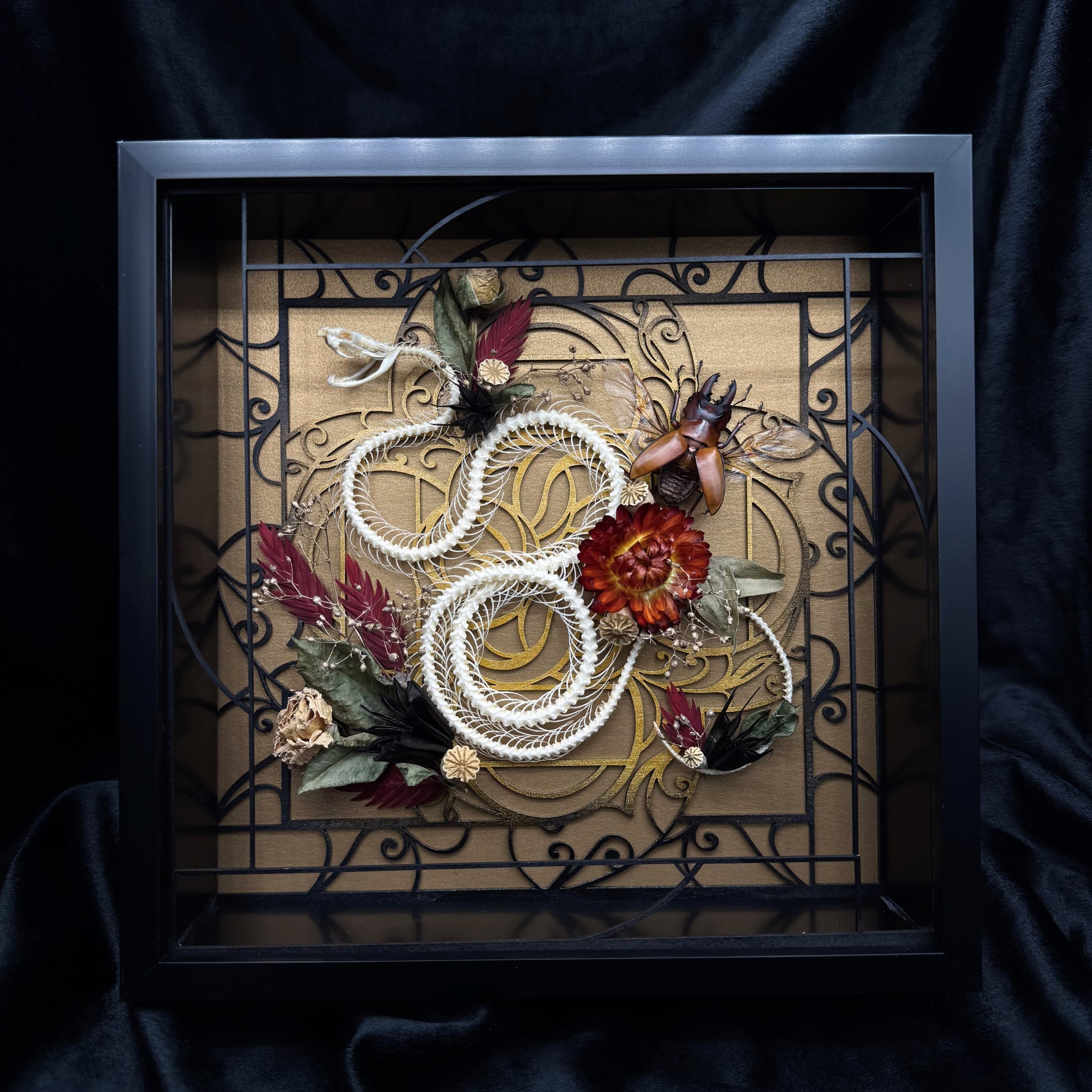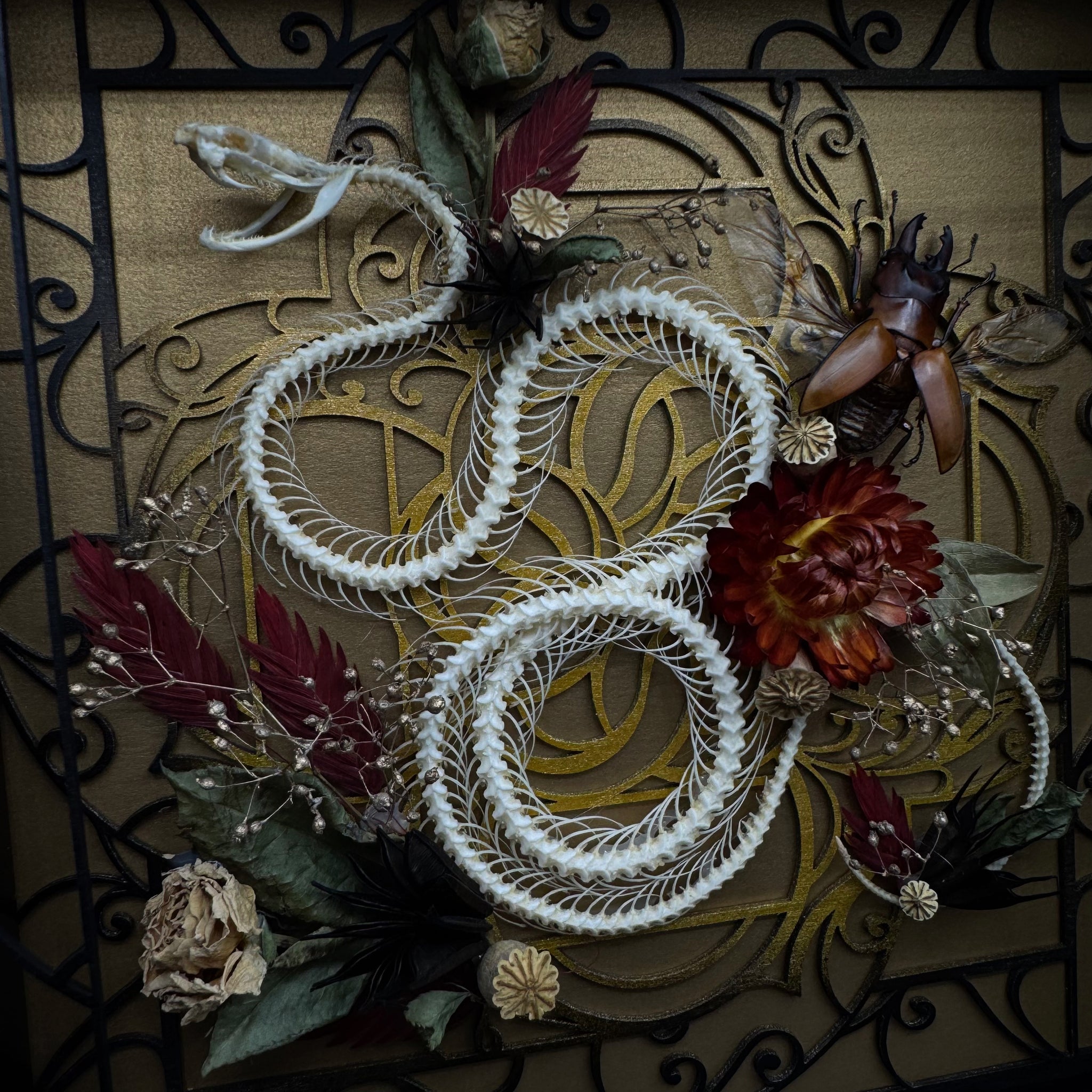Rolling Viper Skeleton specimen with our ‘26 ‘Art Deco’ design in Black and rusted gold coupled with a carefully curated Beetle and Floral arrangement.