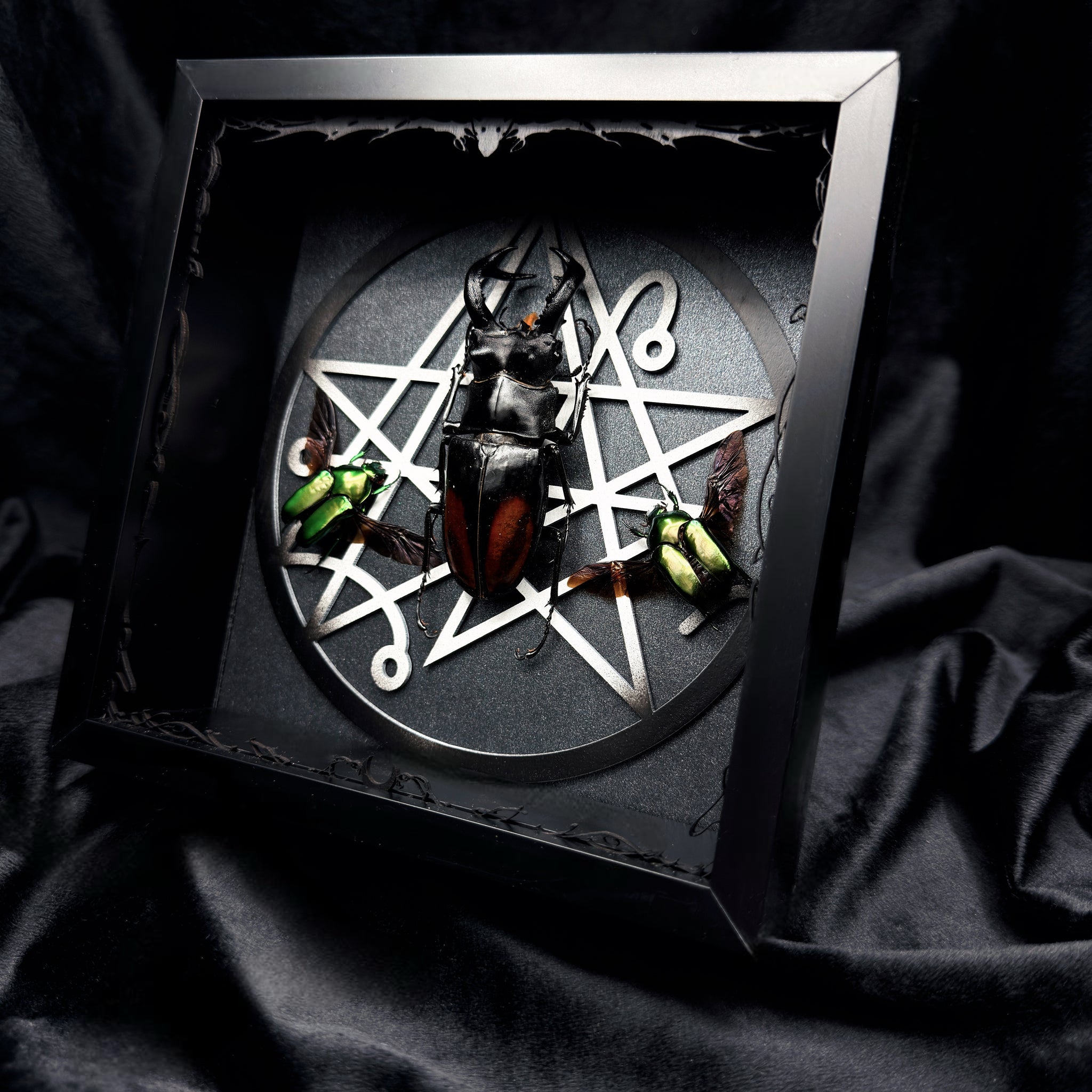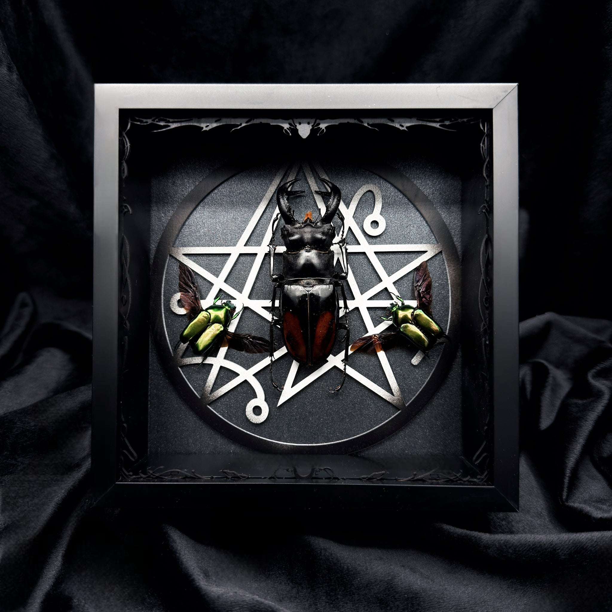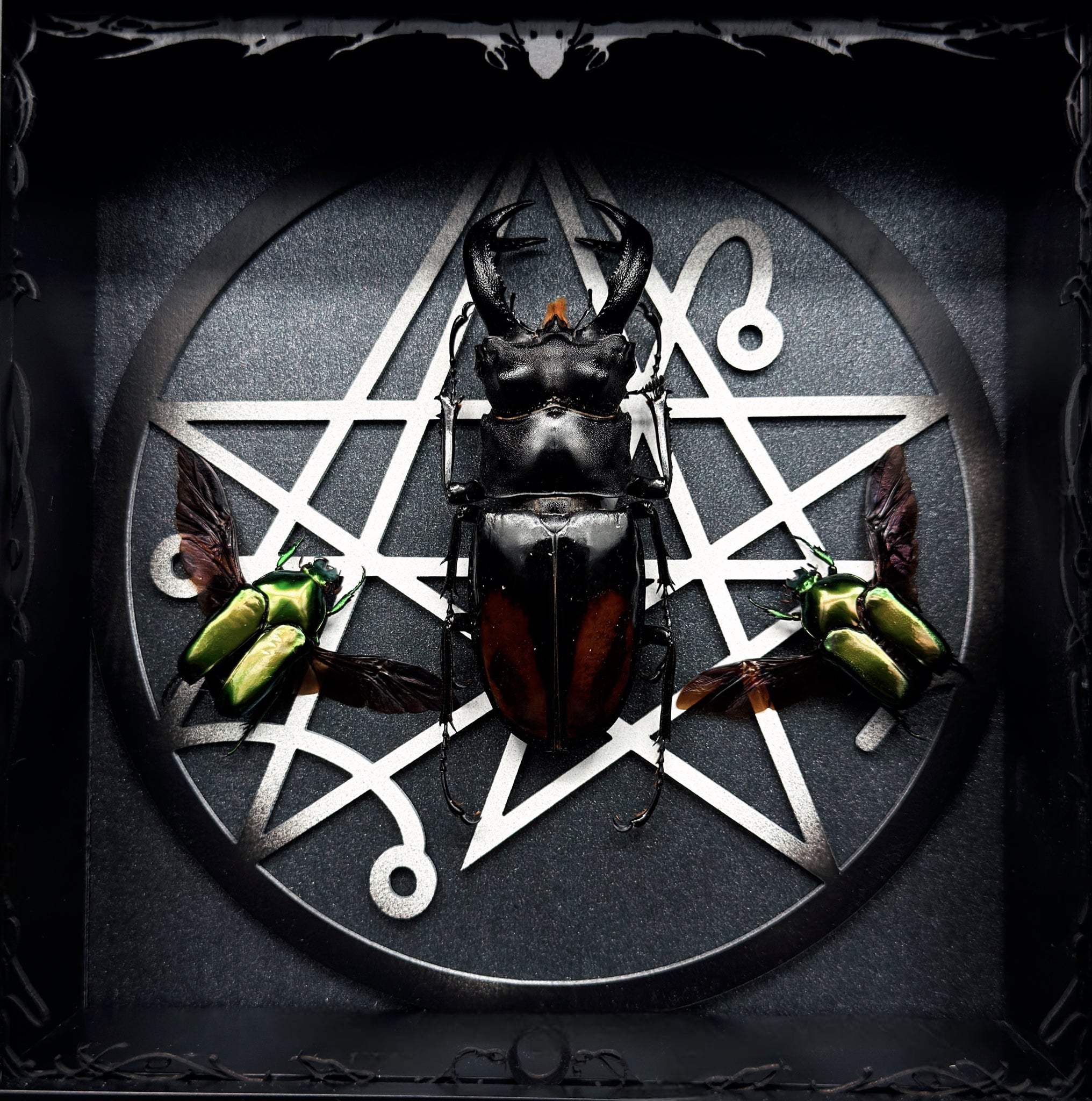 Deer Horn Stag Beetle & 2x Green Banded Jewel Beetle specimens with our ‘26 ‘Necronomicon’ design in all black.