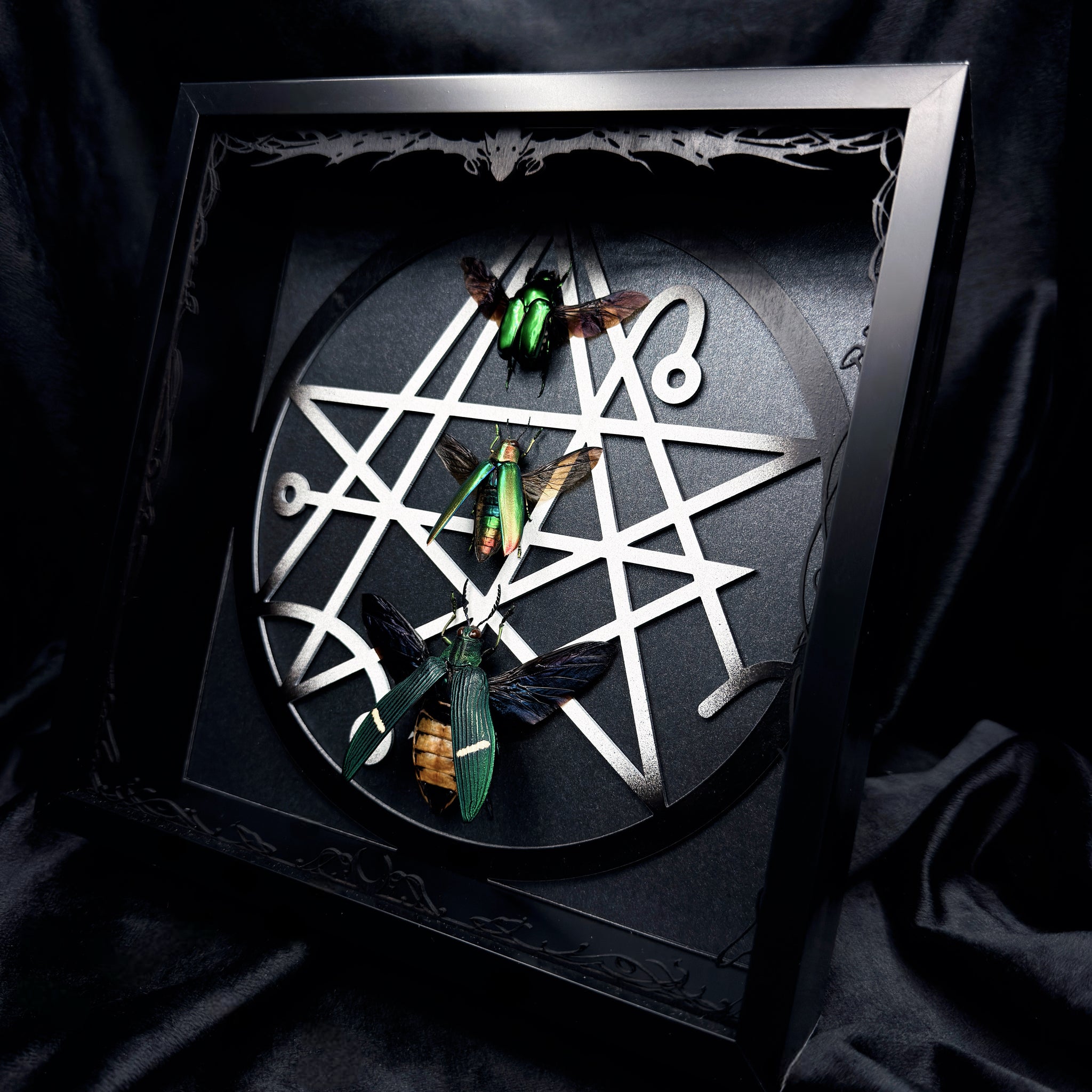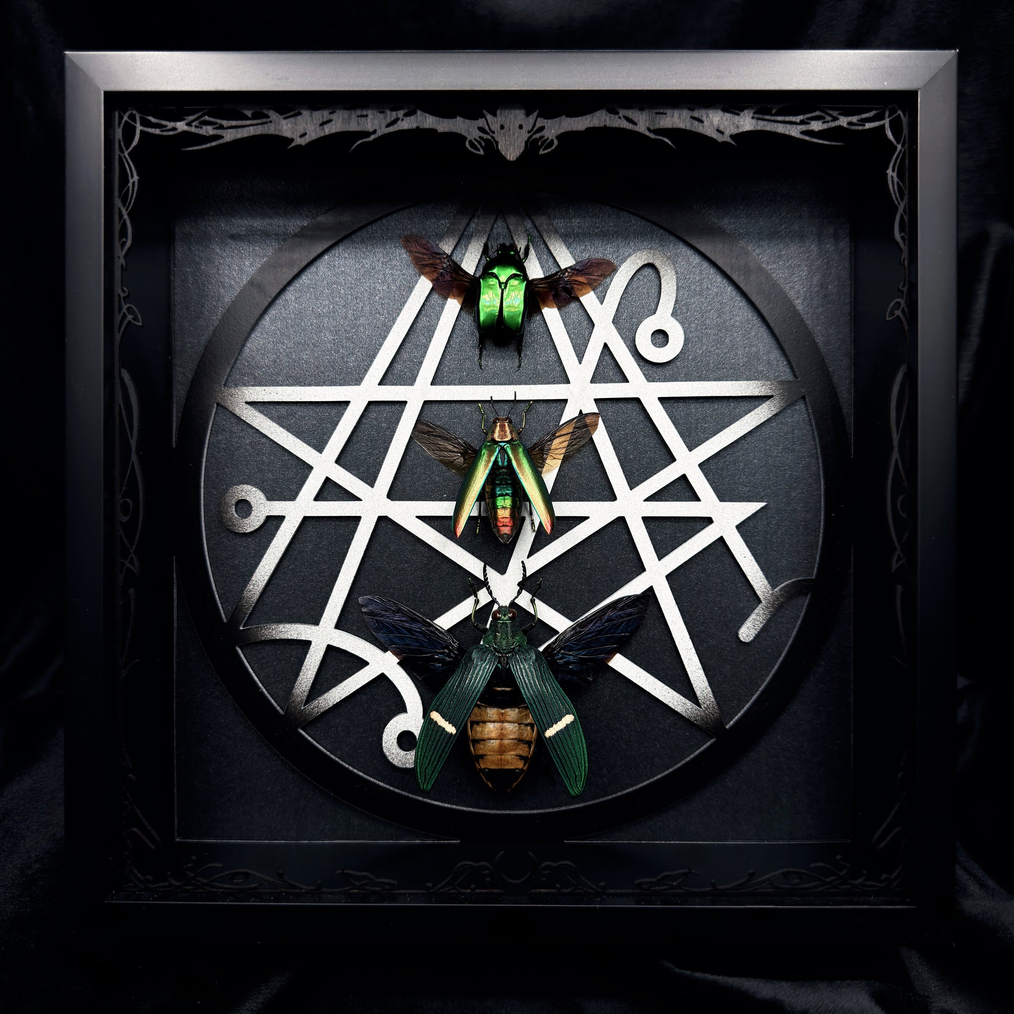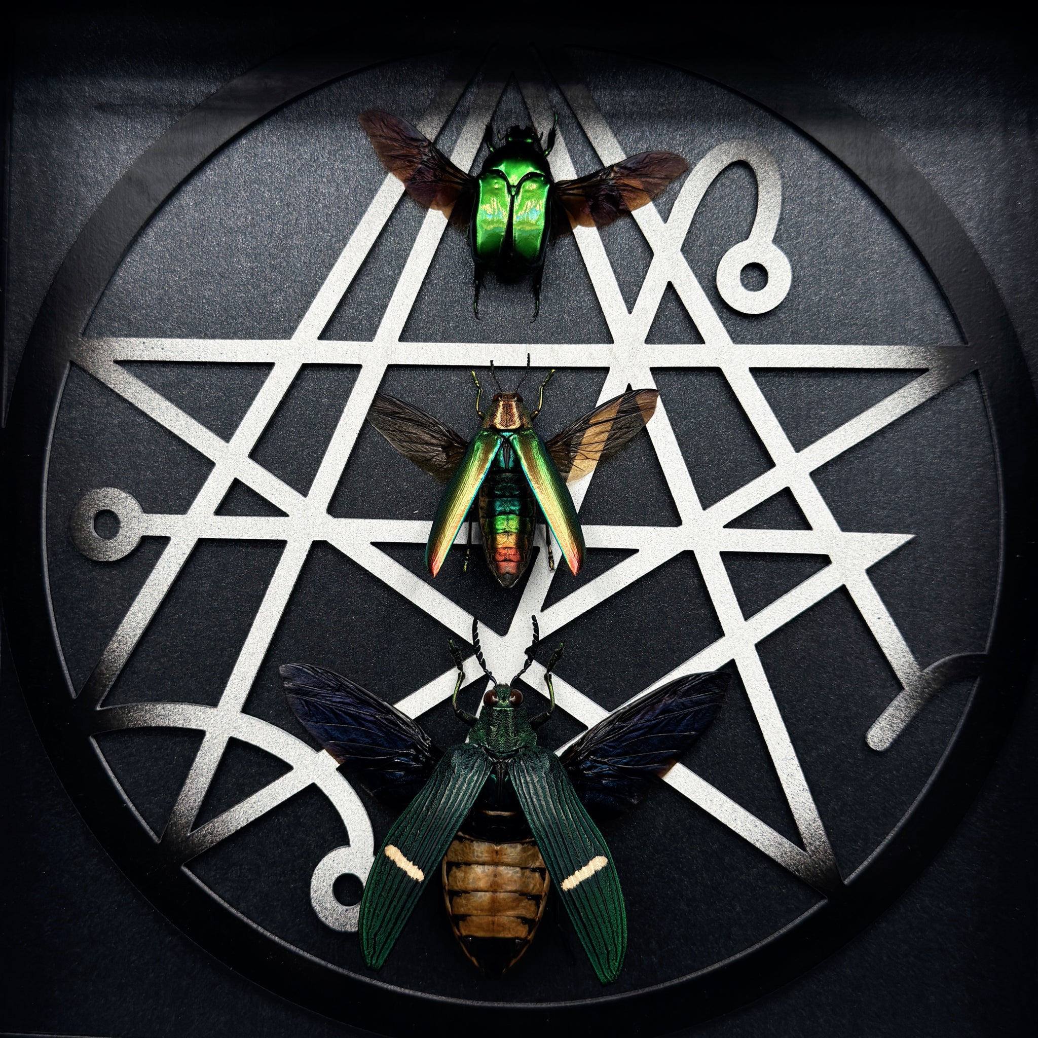 Ritsema’s Flower Beetle, Aurora Jewel Beetle & Green Banded Jewel Beetle specimens with our ‘26 ‘Necronomicon’ design in Black and White.