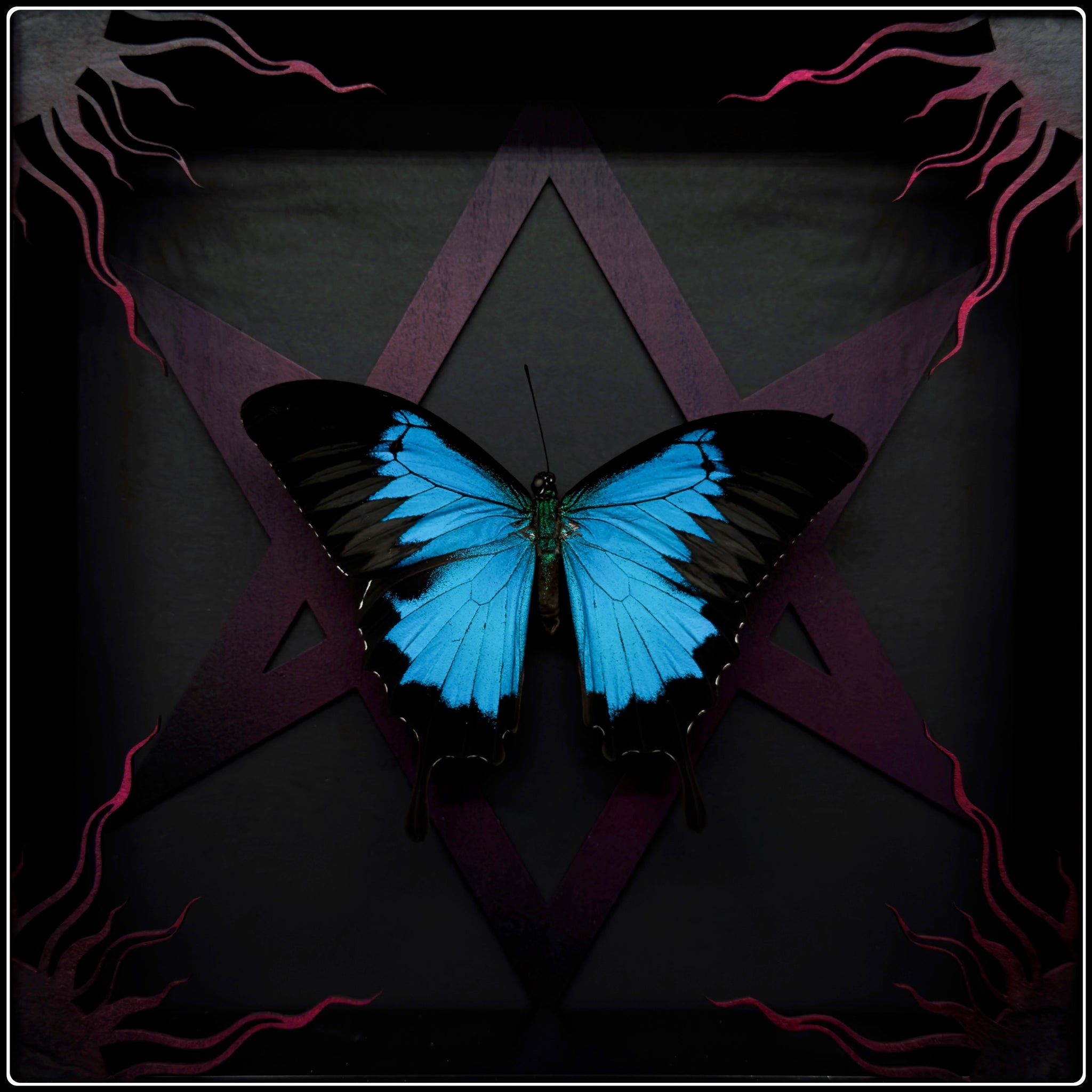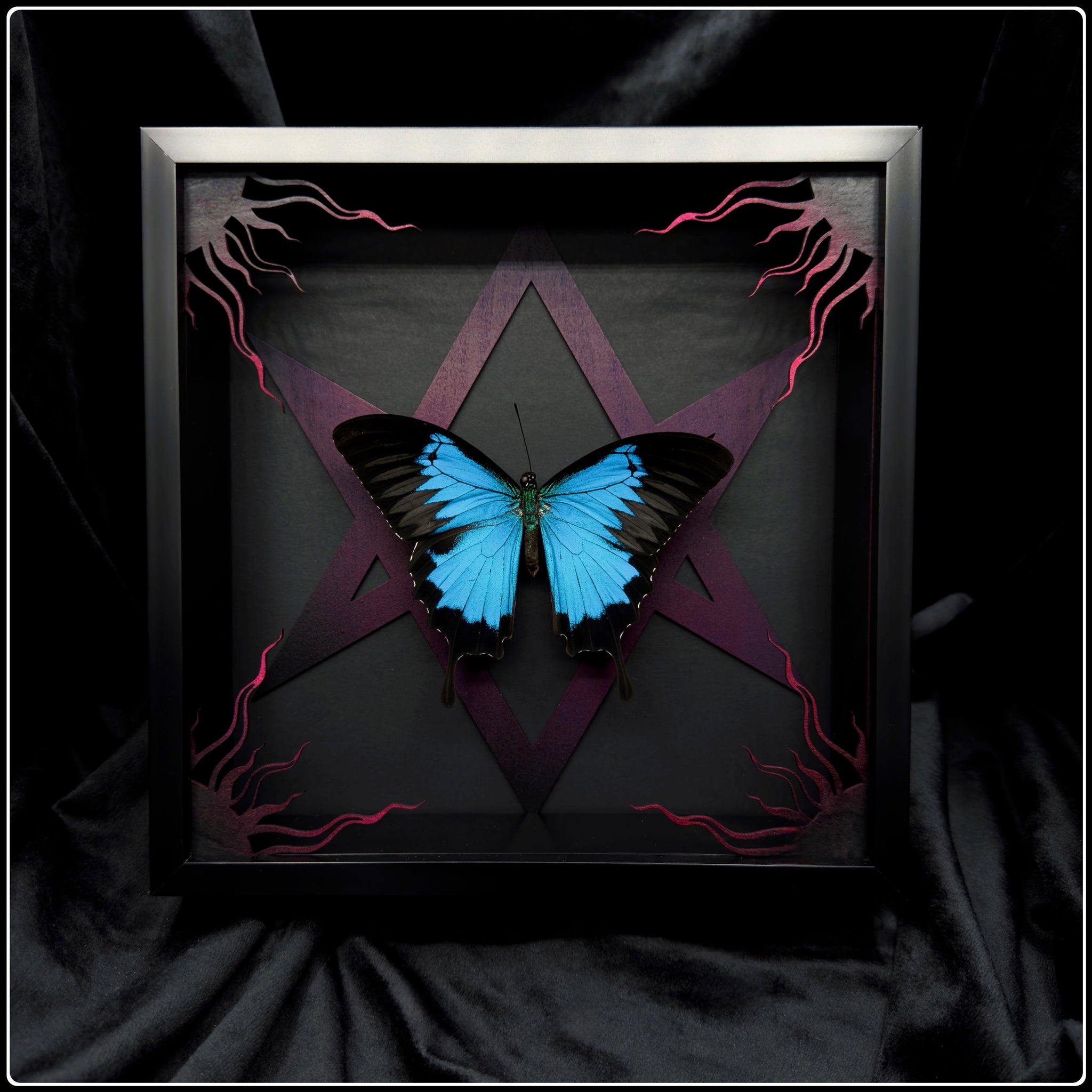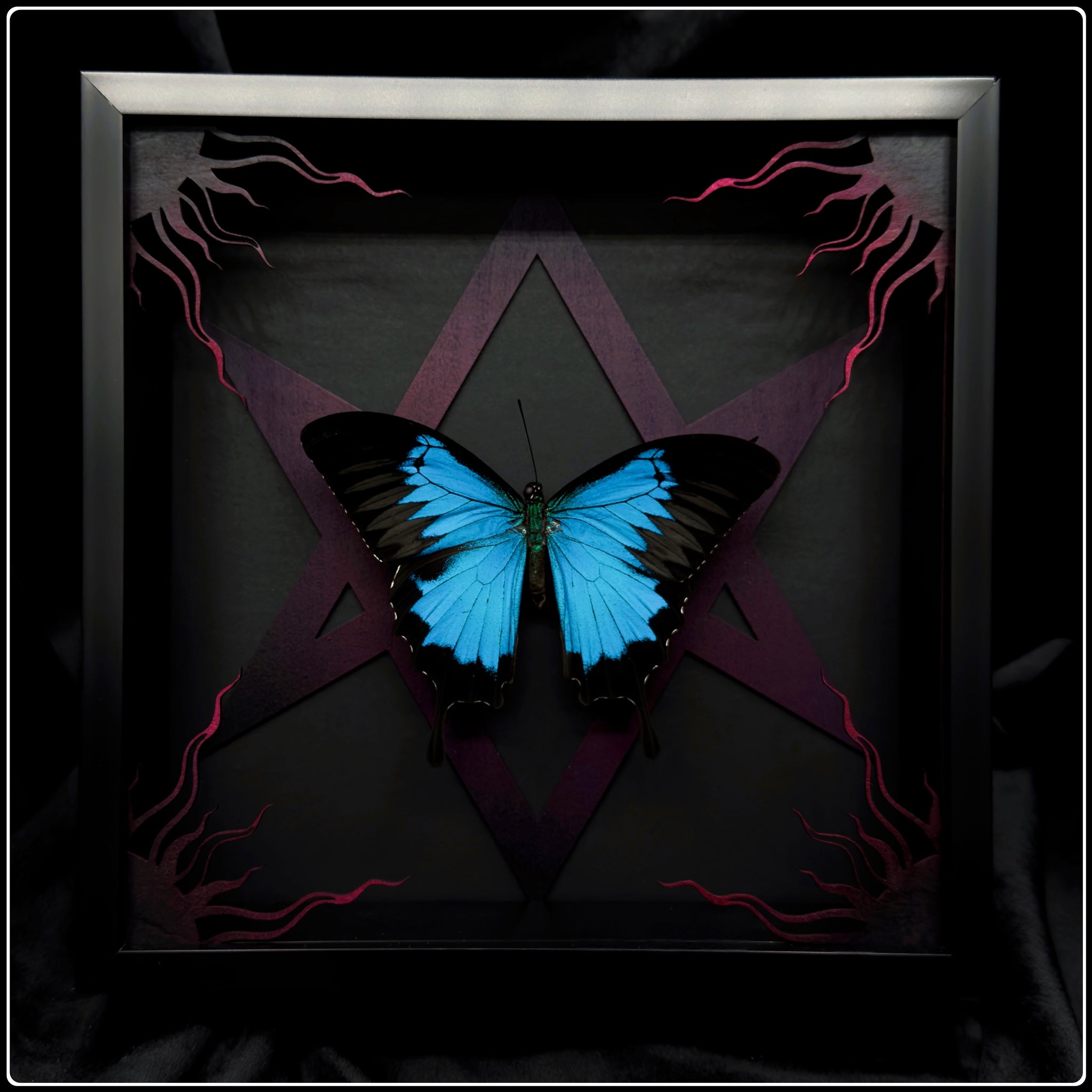 Papilio Ulysses specimen with our Unicursal hexagram design in purple/black.