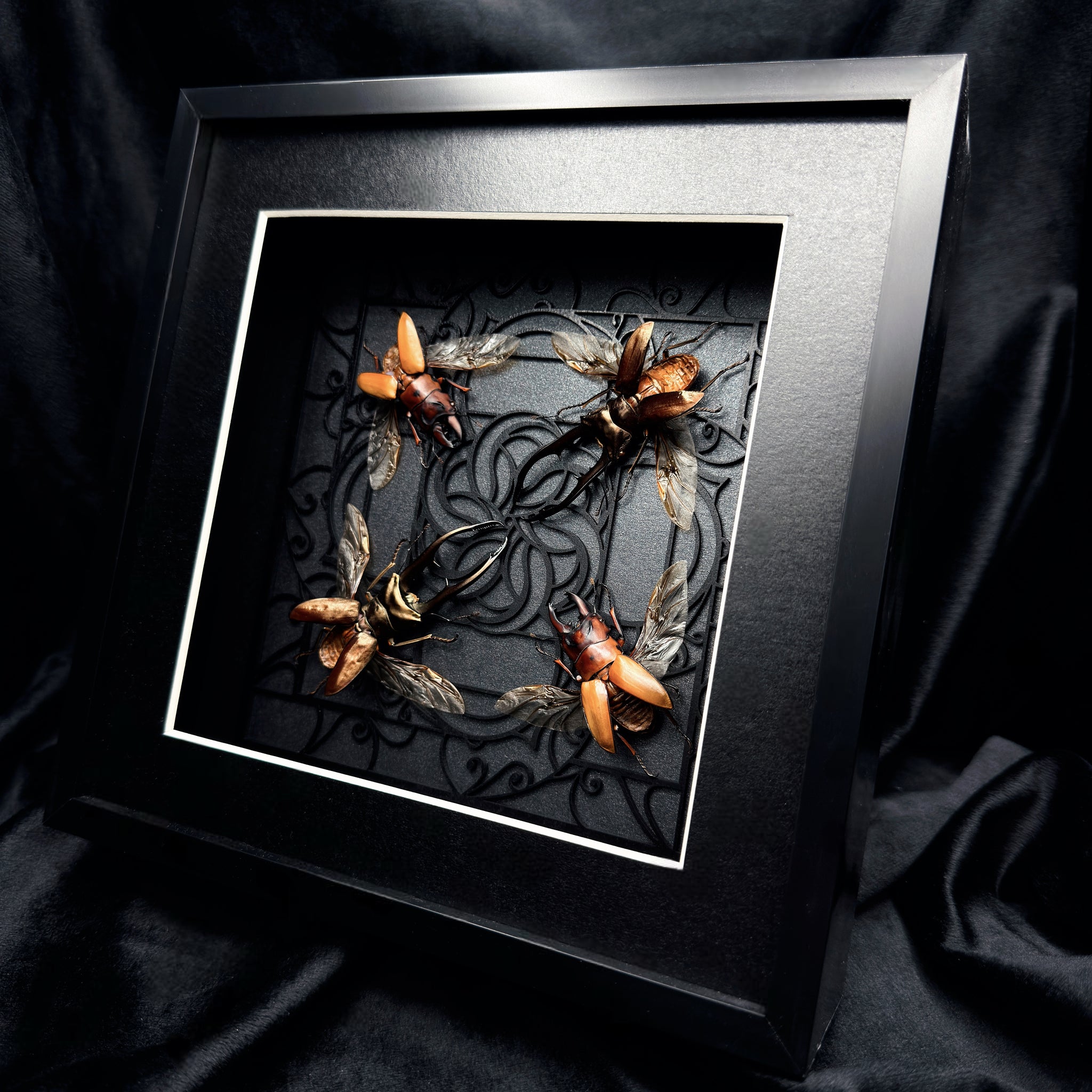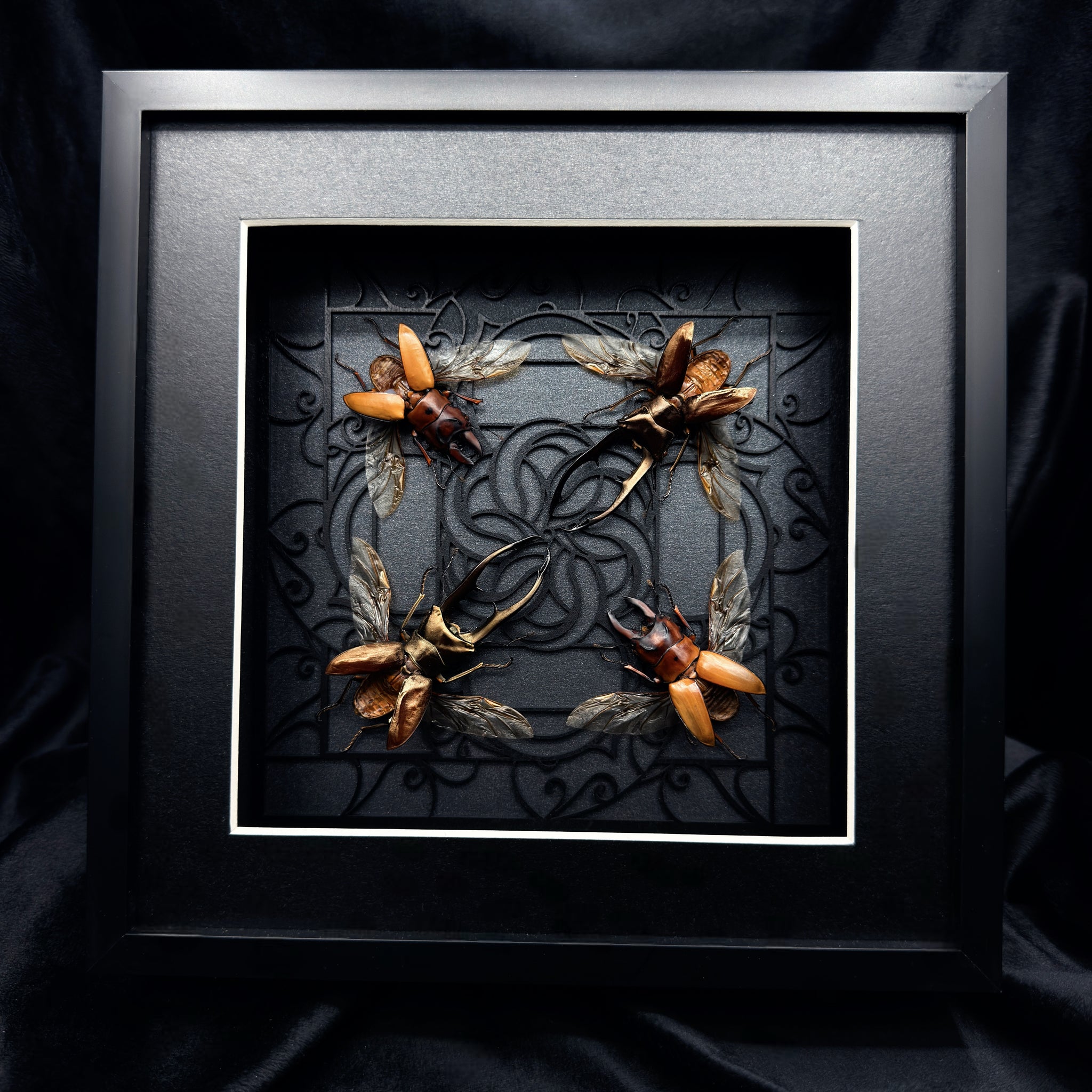 A quatro of Stag Beetle specimens with our ‘26 Cathedral Window design in Black & White.