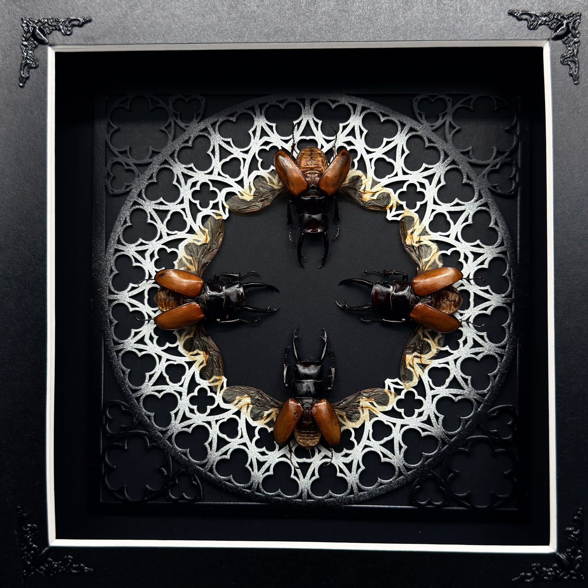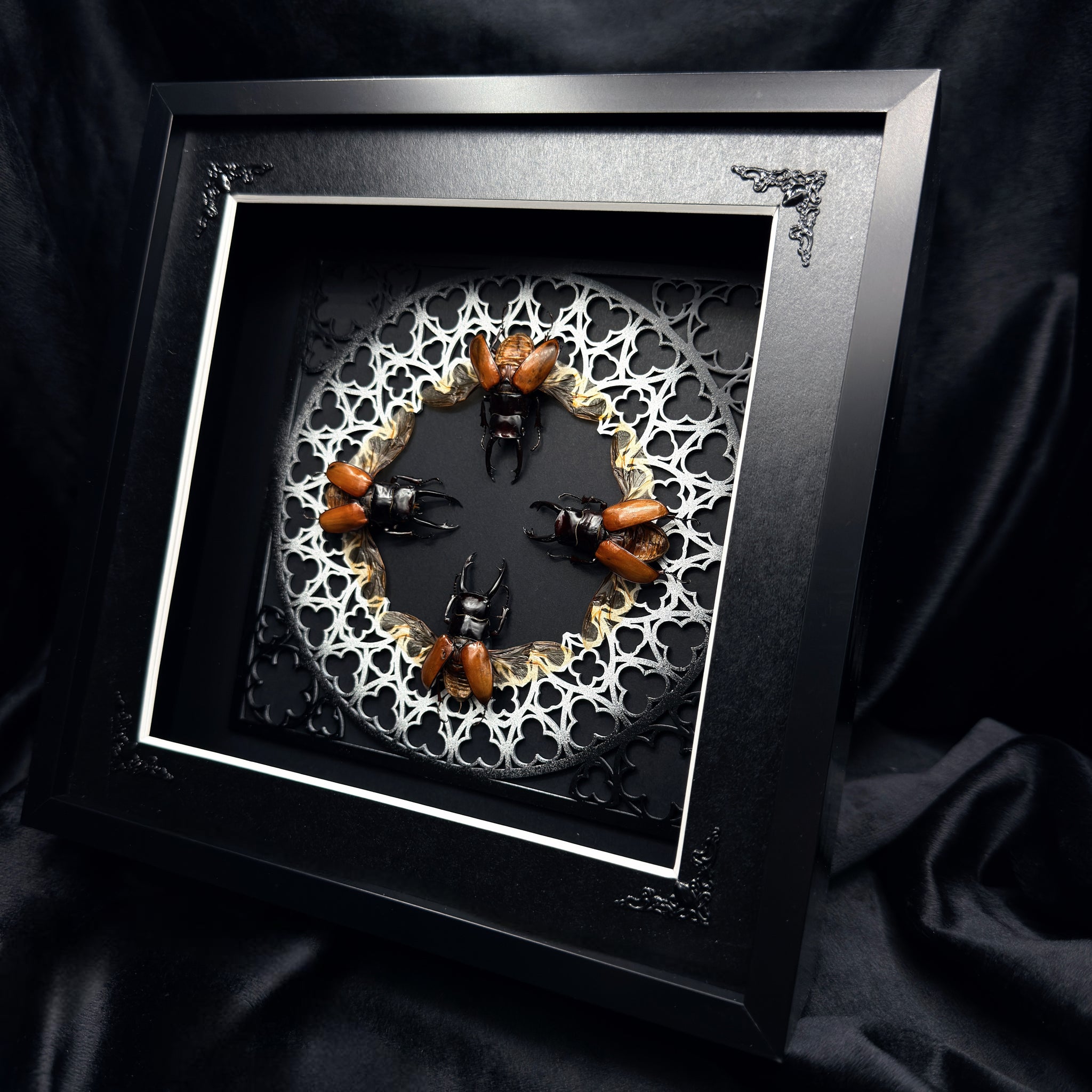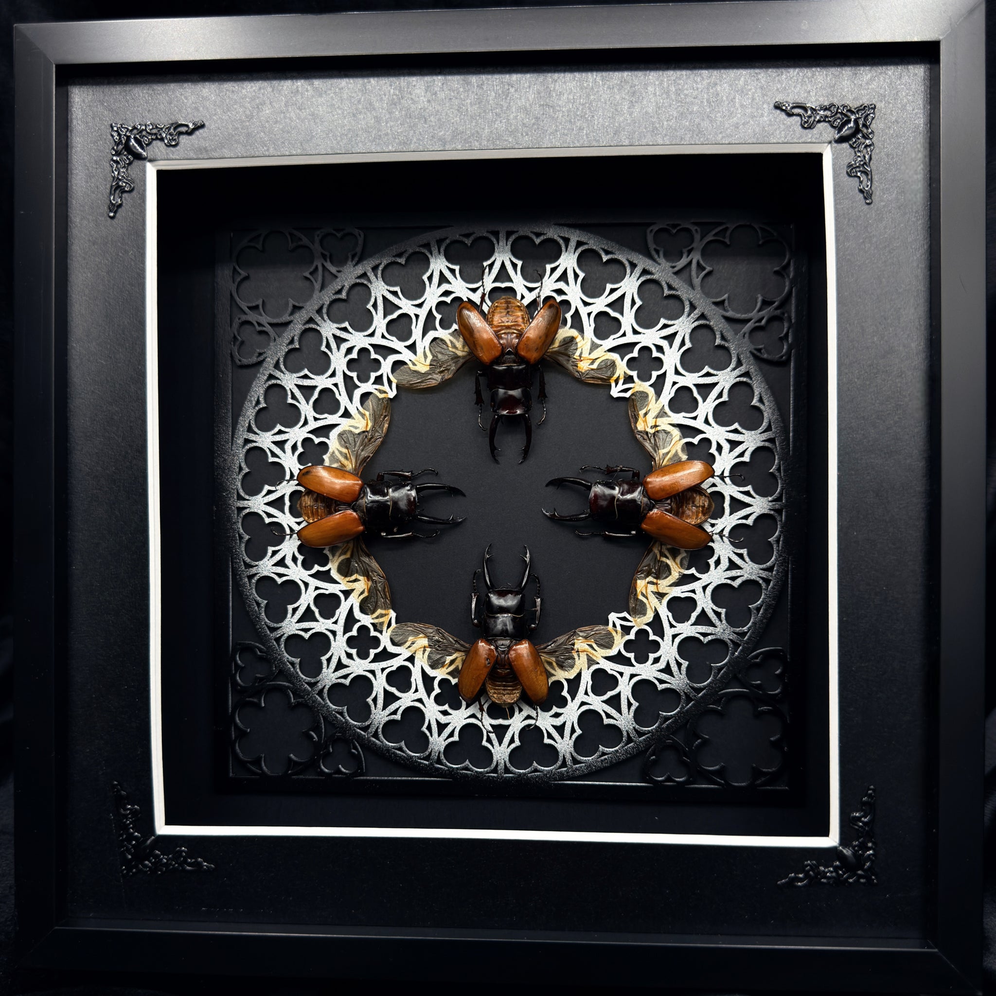 A quatro of Stag Beetle specimens with our ‘26 Cathedral Window design in Black & White.