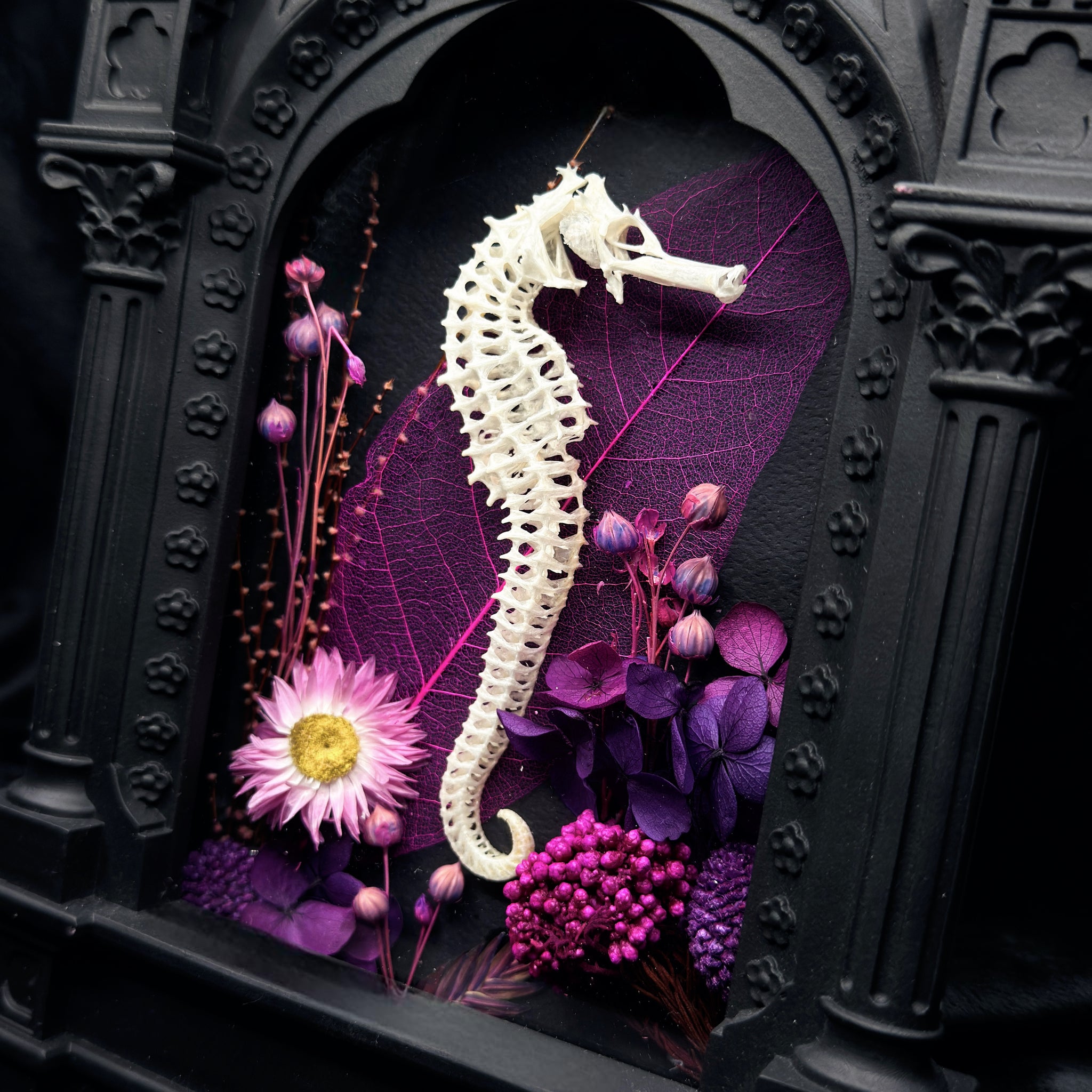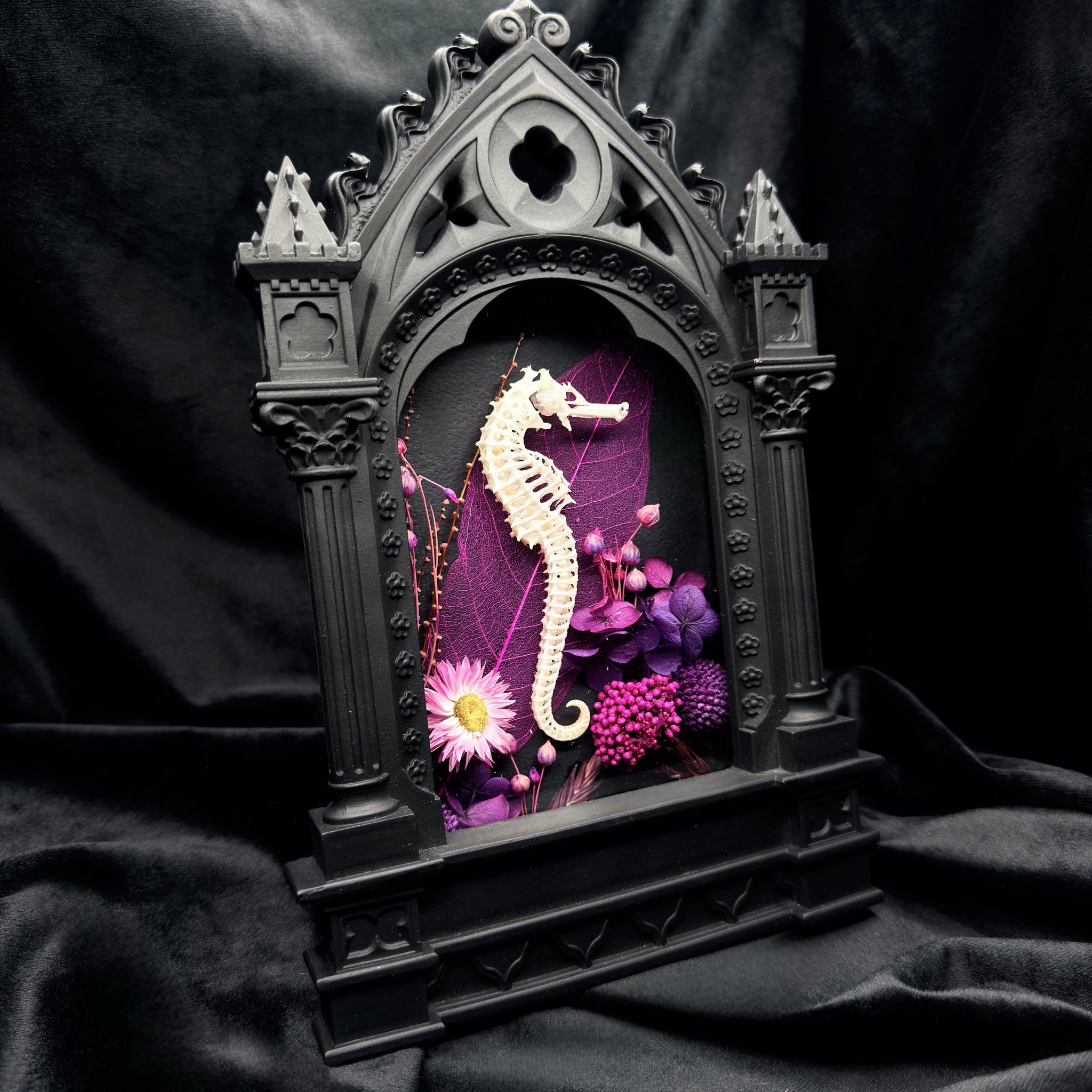 Transform your space with this striking piece, unique and exclusive to ITB. A spectacular Sea Horse Skeleton, elegantly posed, is mounted on a genuine Alchemy Gothic Cathedral frame. The frame is carefully adorned with a selection of florals, creating a luxurious backdrop that accentuates the intricate details of the skeleton. Perfect for gothic interiors, occult collectors, and lovers of the strange and unusual.