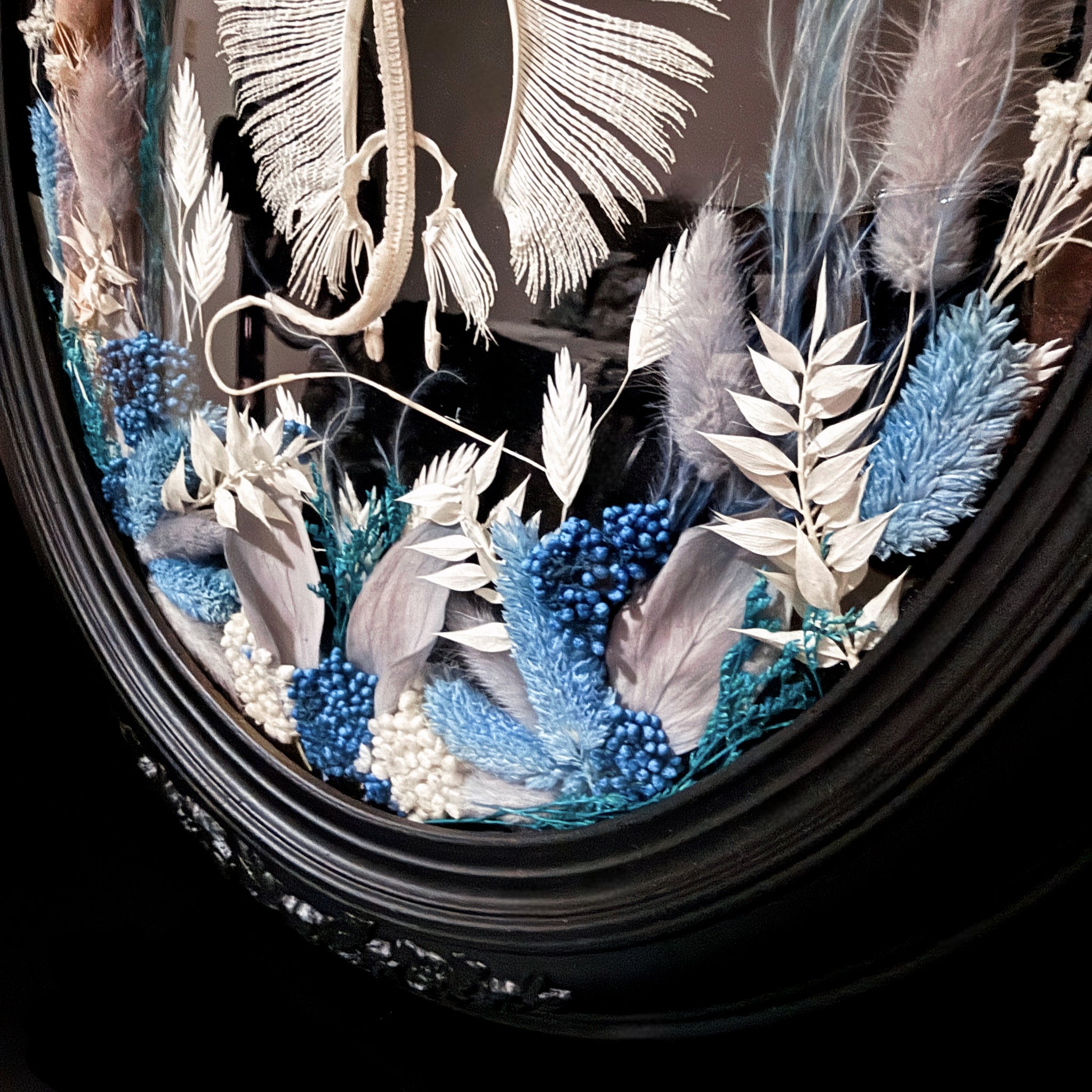 A one off original design by Into The Black, this refurbished vintage frame features a rare stingray skeleton mounted upon black upholstery velvet. The skeleton in framed by meticulously hand arranged preserved florals