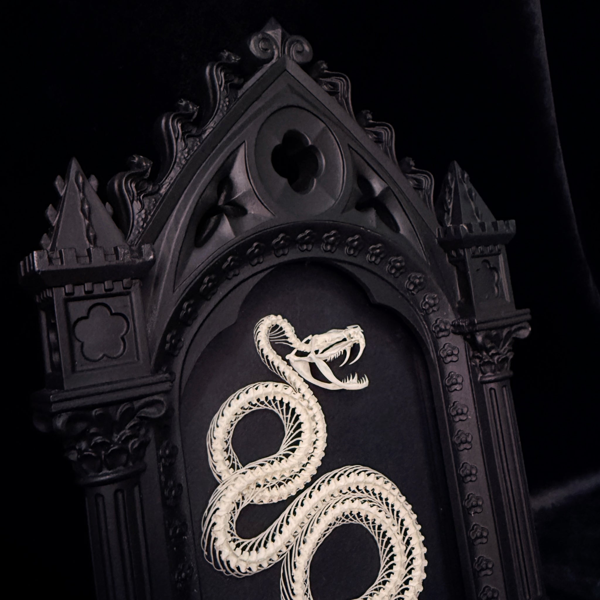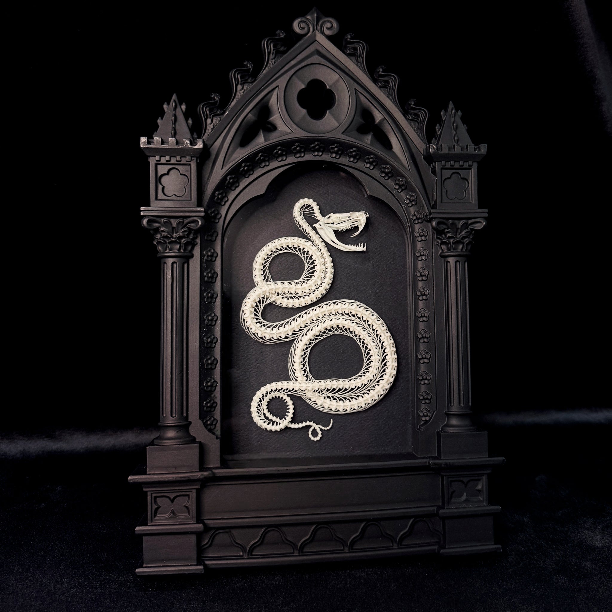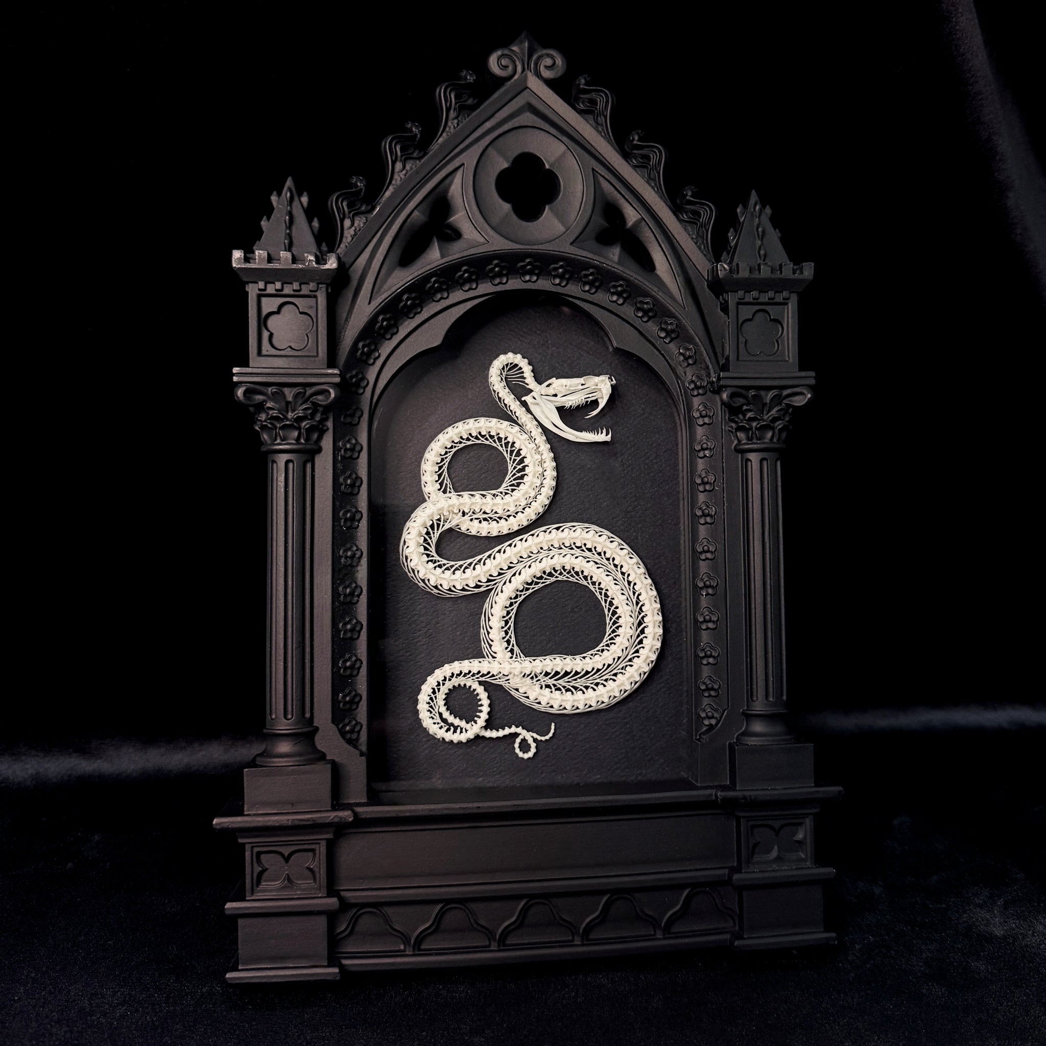 Transform your space with this striking piece, unique and exclusive to ITB. A spectacular Viper Skeleton, elegantly posed, is mounted inside a genuine Alchemy England Cathedral frame. The frame has been repurposed to create depth and includes a glass frontage to protect your specimen Perfect for gothic interiors, occult collectors, and lovers of the strange and unusual.