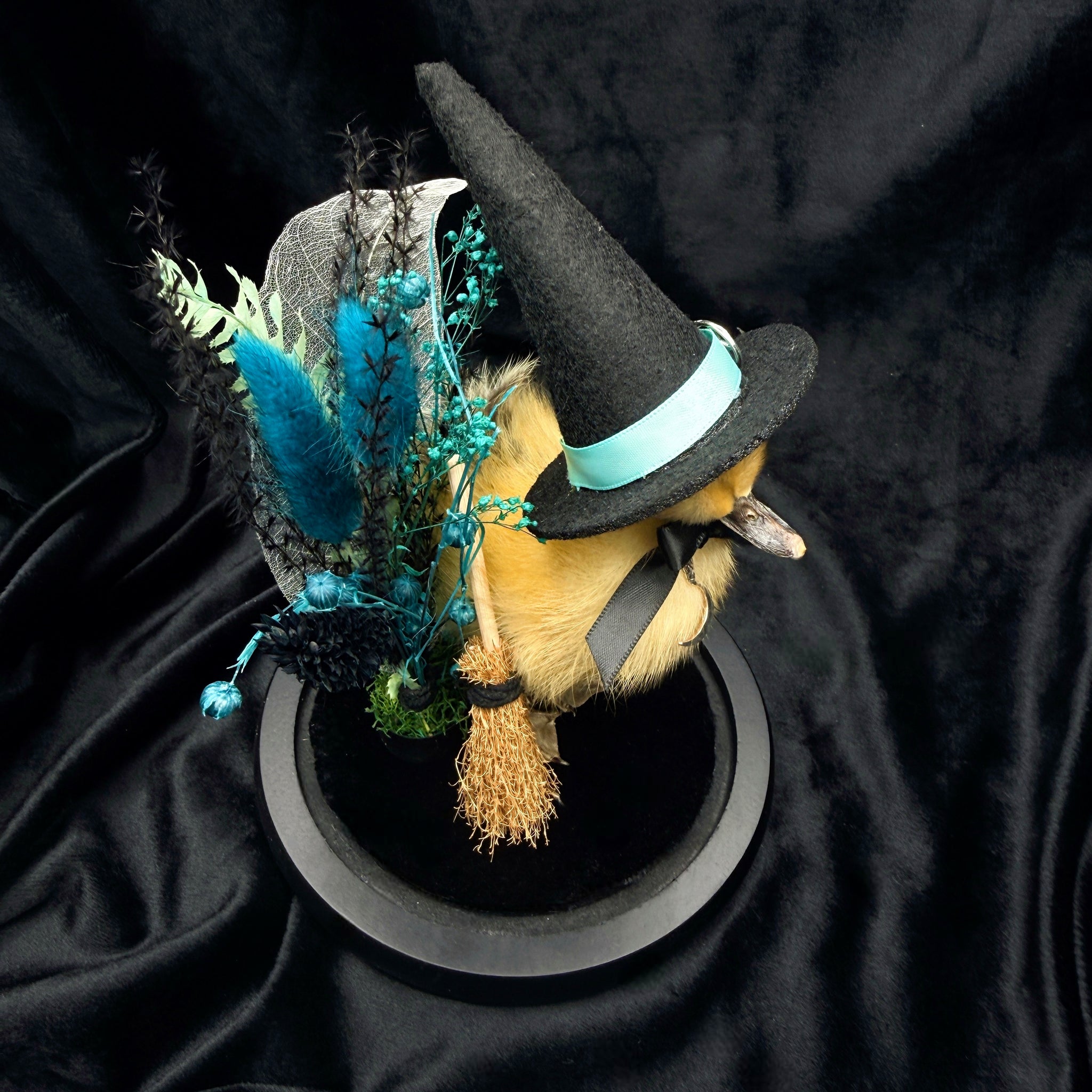 Maeve the Witch Duckling is displayed in a stunning globe with a black velvet base. Miniature broom by her side, she wears a tiny witches hat embellished with a scythe charm whilst a beautiful bouquet of flowers fill the dome.