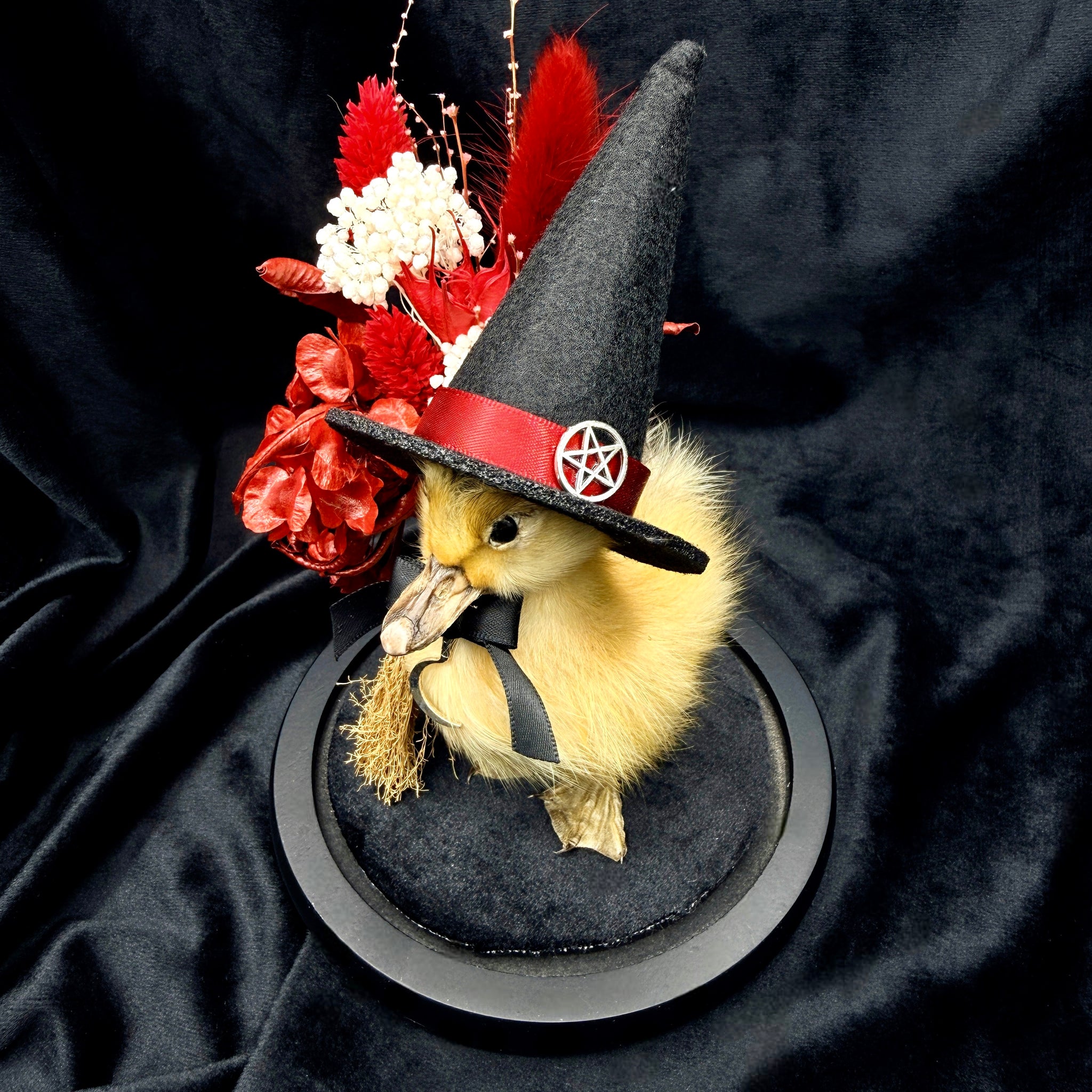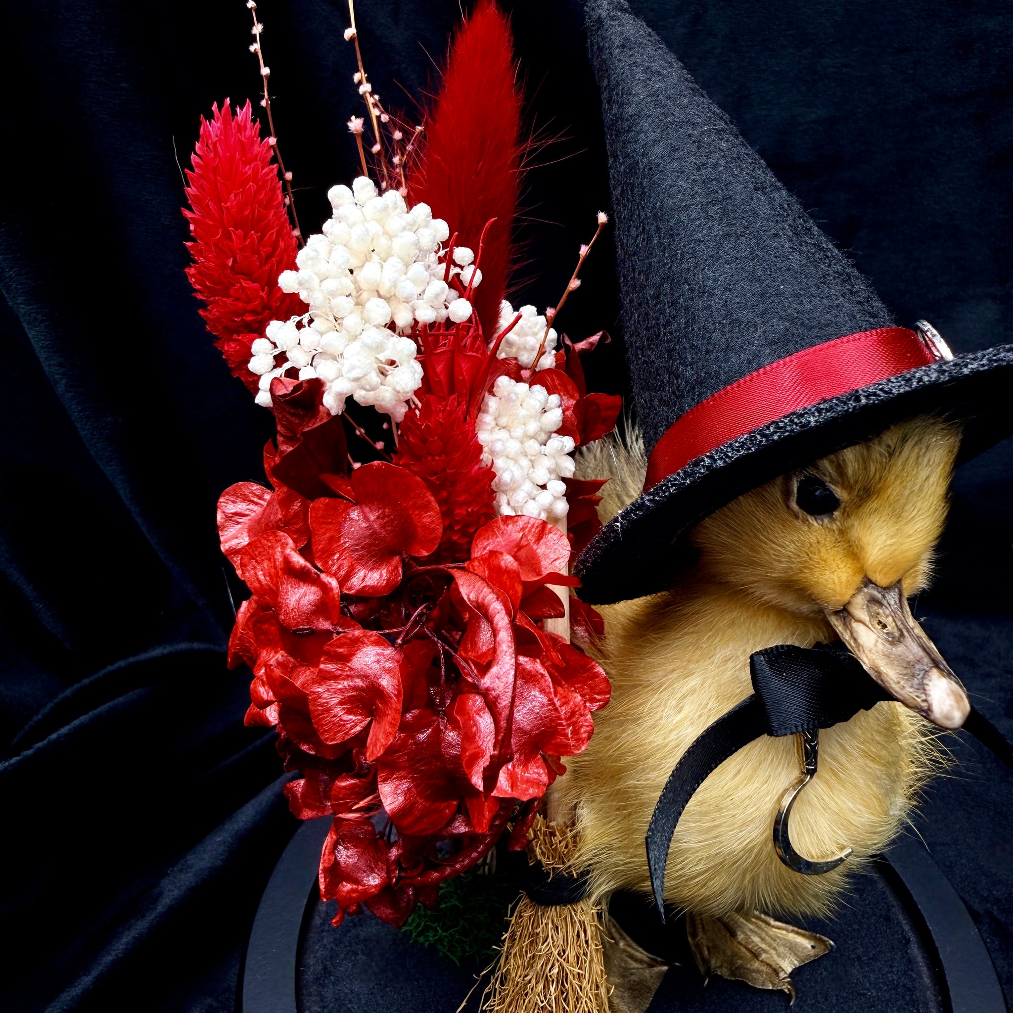 Salem the Witch Duckling is displayed in a stunning globe with a black velvet base. Miniature broom by her side, she wears a tiny witches hat embellished with a scythe charm whilst a beautiful bouquet of flowers fill the dome.